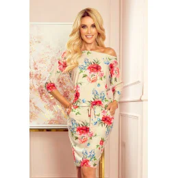 Dámske športové šaty s kapsičkami - béžový ľan a červené kvety 13-121