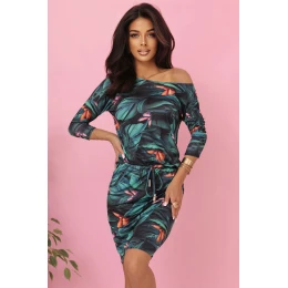 Športové šaty s lodičkovým výstrihom a tropickým 3D vzorom listov a motýľov. Pohodlné, elastické a štýlové - ideálne na leto. poľský výrobok: Numoco.