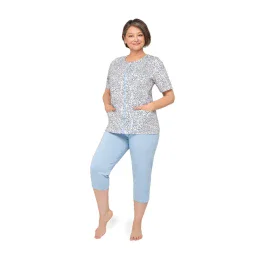 Dámske bavlnené pyžamo s vreckami a zapínaním na gombíky. Nohavice sú hladké, v páse na gumu, v 3/4 dĺžke.