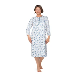 Dámske tričko s dlhými rukávmi z jemnej vzorovanej bavlny s digitálnou potlačou. Otvorený výstrih, riasenie na prsiach, dĺžka trička po kolená.