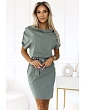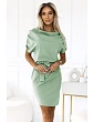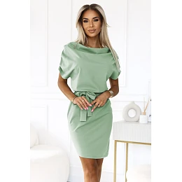 Tieto pistáciové ceruzkové šaty Numoco majú opasok v páse, krátke rukávy a dĺžku pred kolená. vyrobené v Poľsku.