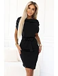 Model má široký, jemne splývavý výstrih a krátke rukávy s nápadným riaseným vzorom na ramenách. V páse je opasok na zaväzovanie z rovnakej látky na úpravu obvodu. Spodná časť má rovnú, ceruzkovú líniu a dĺžka siaha pod kolená, čo je vhodné na denné aj elegantnejšie štylizácie.