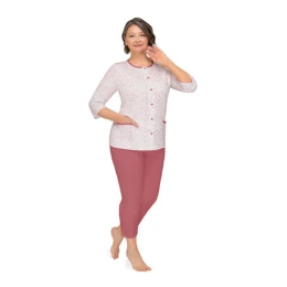 KASIA II 266 je pohodlná súprava pyžama určená pre ženy, ktoré oceňujú praktické riešenia a prírodné materiály. Je vyrobená zo 100 % bavlny, je mäkká, priedušná a šetrná k pokožke. Blúzka s 3/4 rukávmi, okrúhlym výstrihom a dvoma vreckami je úplne rozopínateľná, vďaka čomu je ideálna pre dojčiace matky. 7/8 dlhé nohavice s elastickým pásom zaručujú pohodlné nosenie. Poľský výrobca zaručuje vysokú kvalitu spracovania.