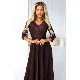 309-14 AMBER elegantné dlhé čipkované šaty s výstrihom - čokoládové