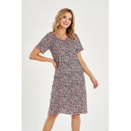 Dámske tričko s krátkym rukávom zo vzorovanej mäkkej bavlny. Košeľa s výstrihom do V a dĺžkou po kolená.
