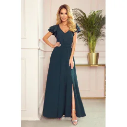 LIDIA - Dlhé dámske šaty v fľaškovo zelenej farbe s výstrihom a volánikmi 310-1