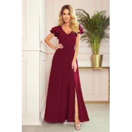 310-5 LIDIA dlhé šaty s výstrihom a volánmi - Bordeaux