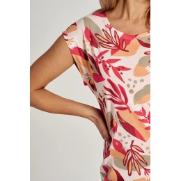Dámské tričko s krátkým rukávem ušité ze vzorované jemné bavlny. Kulatý výstřih, délka košile před kolena, s jemnými bočními rozparky.