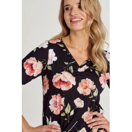 Dámské tričko s krátkým rukávem ušité ze vzorované jemné bavlny. Výstřih do V, košile v délce ke kolenům.