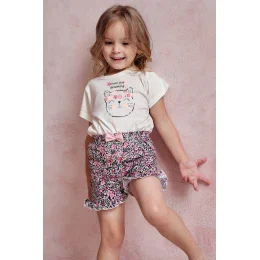 Dievčenské bavlnené pyžamo, tričko s krátkym rukávom a potlačou. Doplnené krátkymi vzorovanými šortkami.