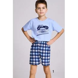 Chlapčenské bavlnené pyžamo, tričko s krátkym rukávom a potlačou. Doplnené krátkymi kockovanými šortkami.