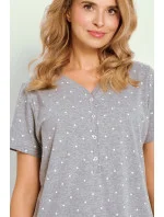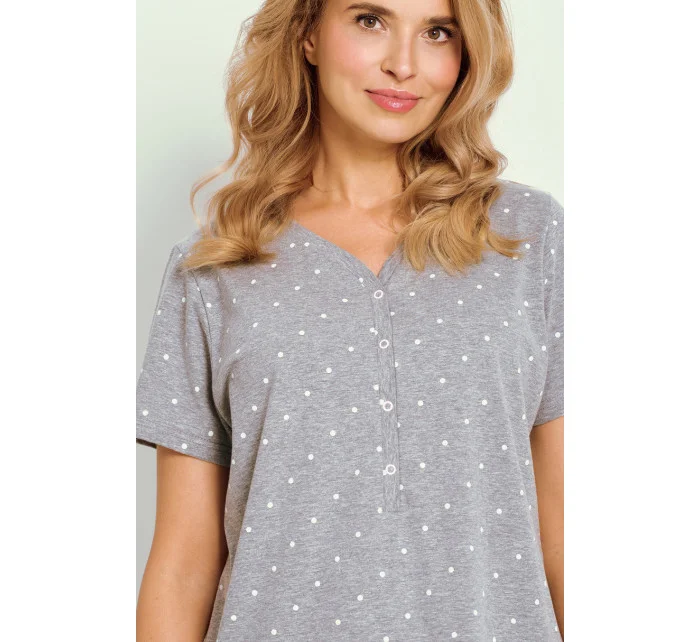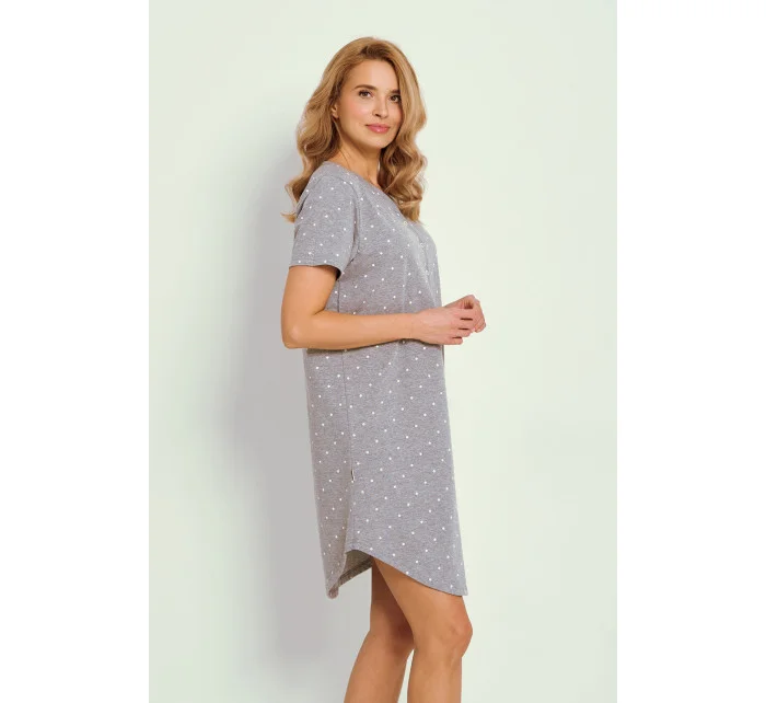 Noční košile s krátkým rukávem, výstřihem do V, otevřeným výstřihem. Spodní část košile je mírně zaoblená.