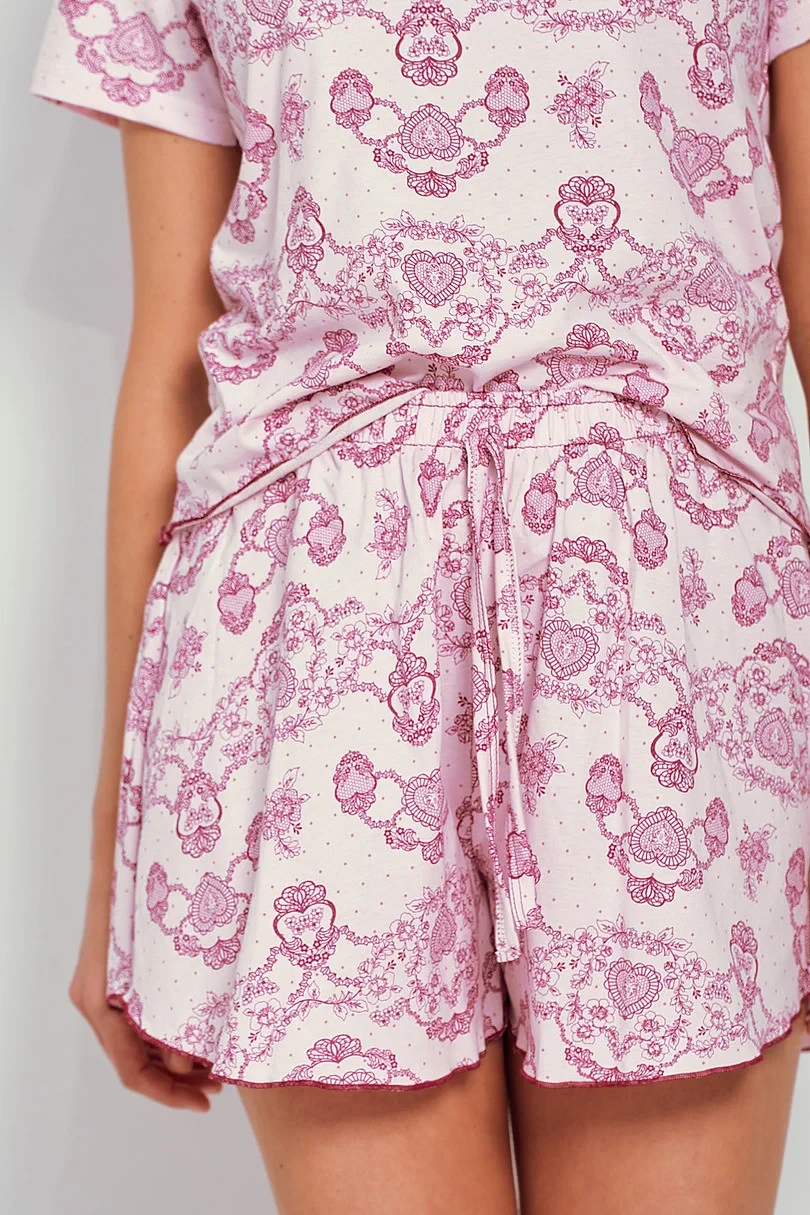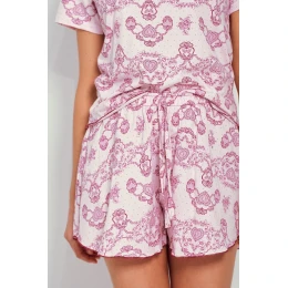 Dámské pyžamo s krátkými rukávy, vyrobené ze vzorované měkké bavlny, doplněné krátkými šortkami. Spodní část košilky a nohavice jsou zakončeny melírem.
