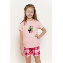 Dievčenské letné pyžamo Taro Veronica je ideálnou voľbou na teplé noci. Je vyrobené zo 100 % mäkkej bavlny, je pohodlné a ľahko sa nosí celú noc. Súprava sa skladá z trička s krátkym rukávom, ktoré zdobí farebná potlač, a krátkych vzorovaných šortiek, ktoré dodávajú šarm a voľnosť pohybu. Vďaka mäkkej a priedušnej tkanine pokožka vášho dieťaťa dýcha a pyžamo je mimoriadne pohodlné. Balené vo fóliovom vrecúšku - ideálne na darček!