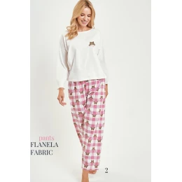 Dámske pyžamo Astrid 3441 je ideálne na chladnejšie noci. Je vyrobené zo 100 % mäkkej, priedušnej bavlny a poskytuje prirodzené pohodlie počas spánku. Vrchnú časť pyžama tvorí voľné tričko s dlhými rukávmi, polkruhovým výstrihom a jemnou potlačou na hrudi. Spodnú časť tvoria flanelové nohavice s módnym károvaným vzorom a elastickým pásom, ktorý zaručuje voľnosť pohybu a pohodlie počas celej noci.