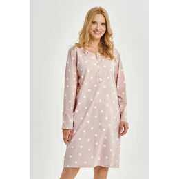 Nočná košeľa Nori 3443 značky Taro je očarujúcou a praktickou voľbou pre ženy, ktoré si cenia pohodlie a romantický štýl. Je vyrobená z vysokokvalitnej bavlny a poskytuje pohodlie a priedušnosť počas celej noci. Vďaka dĺžke po kolená, dlhým rovným rukávom a výstrihu so zapínaním na gombíky je ideálna pre dojčiace matky. Potlač srdiečok dodáva jemný ženský nádych.
