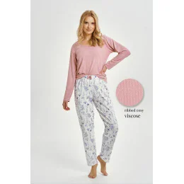Dámska dlhá pyžamová súprava Caroline 3456 je kombináciou pohodlia a ženského štýlu, ktorá je ideálna na chladnejšie noci. Vrchnú časť súpravy tvorí voľné viskózové tričko z mäkkej pruhovanej tkaniny s okrúhlym výstrihom a dlhými rukávmi, ktoré zahalia telo do príjemného tepla. Súpravu dopĺňajú bavlnené nohavice s dlhými nohavicami, ktoré zdobí farebná kvetinová potlač, ktorá dodáva celej súprave sviežosť a šarm. Pohodlná súprava je ideálna na večerný relax a pokojný spánok.
