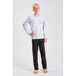 Chlapčenské pyžamo 3507 Julio značky Taro je pohodlná súprava navrhnutá s ohľadom na tínedžerov. Je vyrobené výhradne z prírodnej, priedušnej bavlny, je príjemné na dotyk a bezpečné pre pokožku. Tričko s dlhými rukávmi a polkruhovým výstrihom má na prednej strane atraktívnu potlač, ktorá pôsobí moderne, zatiaľ čo nohavice s dlhými nohavicami majú zaujímavý vzor a elastický pás zaručuje voľnosť pohybu a pohodlné nosenie. Toto praktické a módne pyžamo je dostupné vo veľkostiach 146-158 a je ideálne na spanie a každodenný domáci relax.