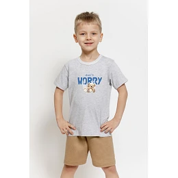 Tričko v svetlom melanžovom vyhotovení má okrúhly výstrih a roztomilú potlač s medvedíkom a nápisom "Don't Worry" (Neboj sa), ktorá dodáva pyžamu detský charakter. Vďaka mäkkej a priedušnej bavlne je materiál príjemný k pokožke a zaručuje pohodlný spánok.
