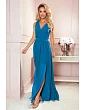 Justine - dlhé maxi šaty s výstrihom, rozparkom na nohách a zaväzovaním na chrbte. vyrobené zo vzdušnej tkaniny v tmavomodrej farbe. vzadu na krytý zips. poľský výrobok. značka numoco.