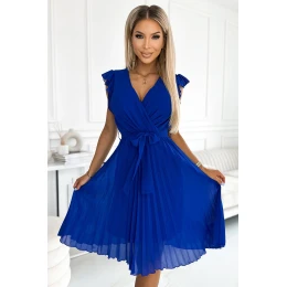 Polina - šifónové plisované šaty s výstrihom a volánmi na ramenách. farba: chrpová. značka numoco. poľská výroba.