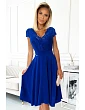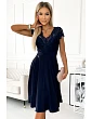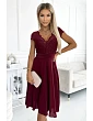 Model má čipkovaný vrchný diel s výstrihom do V a krátkymi čipkovanými rukávmi. Pás je zvýraznený hladkým opaskom s jemnými záhybmi a v spodnej časti je rozšírená midi sukňa, ktorá pekne splýva. Čipka sa nachádza aj na chrbte, vďaka čomu je celý vzhľad kompletný a elegantný.