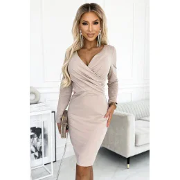 Elegantné šaty s obálkovým výstrihom a dlhými rukávmi. vyrobené z mierne elastickej bavlnenej tkaniny v béžovej farbe. zapínajú sa vzadu na krytý zips. značka numoco. poľská výroba.