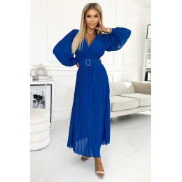 Klara - plisované šifónové šaty s výstrihom, dlhými rukávmi a opaskom. plisovanie na výstrihu a rukávoch dodáva šatám eleganciu.Farba: chrpová.Značka numoco.