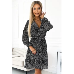 Pridanie recenzie k 506-1 Šifónové šaty s výstrihom, volánom a opaskom - čierno-biely vzor