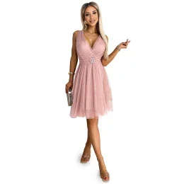 Olga - kobieca tiulowa sukienka z dekoltem i ozdobną klamerką. Tył sukienki uszyty został z elastycznej gumonitki, dzięki czemu dopasuje się do większości rozmiarów. Kolor: brudny róż. Marka numoco basic. Produkt europejski.