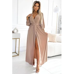 Dlhé šaty so širokým pásom a výstrihom - béžové