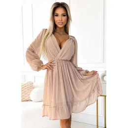 Mila - šifónové midi šaty s dlhými rukávmi a elegantne zakončeným výstrihom. farba: béžová. celé šaty sú podšité. značka numoco. poľská výroba.