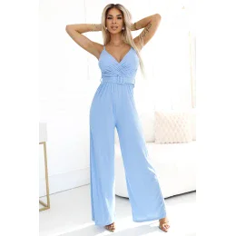 593-2 Elegantný overal s obálkovým výstrihom, širokými nohavicami a opaskom - MODRÝ