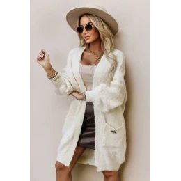 Stylový dámský kardigan z měkkého béžového úpletu ve volném střihu bez knoflíků s praktickými kapsami a ozdobnou broží se skvěle hodí k ležérnímu i elegantnímu vzhledu. značka Numoco Basic.