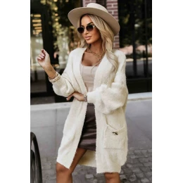 Štýlový dámsky kardigán z mäkkej béžovej pleteniny, tento voľný nezapínaný štýl s praktickými vreckami a ozdobnou brošňou je ideálny pre ležérny aj elegantný vzhľad. značka Numoco Basic.