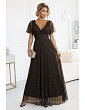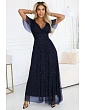 Pútavý výstrih do V na chrbte a zaväzovanie v páse umožňujú šatám prispôsobiť sa postave a dodať jej štíhlu líniu. Materiál je vyrobený z ľahkej, pružnej sieťoviny s lesklými bodkami, vizuálne príjemný a ideálny na špeciálne príležitosti.