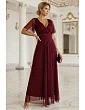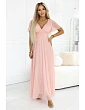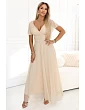 Obopínajúci vrchný diel s výstrihom do V krásne sedí na siluete a opticky zoštíhľuje krk. Pás je zvýraznený jemným riasením, vďaka čomu celý vzhľad pôsobí žensky a veľmi symetricky. Spodný diel je dlhý, vzdušný a na vrchnej vrstve mierne priesvitný, čo vytvára efekt ľahkosti a pohybu.