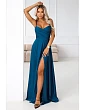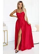 Model má priliehavý vrchný diel s tvarovaným poprsím a srdiečkovým výstrihom a tenké nastaviteľné ramienka pre lichotivý strih. Pás je zvýraznený a spodný lem je rozšírený do uvoľnenej maxi dĺžky, ktorá vyzerá dobre na cestách. Vpredu má vysoký rozparok na nohy, ktorý opticky zoštíhľuje a uľahčuje voľnú chôdzu.