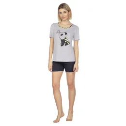 Dámske pyžamo s krátkymi rukávmi z jemnej bavlny. Ozdobná potlač na úrovni hrudníka. Okrúhly výstrih lemovaný kontrastným lemovaním. Krátke jednotné šortky.