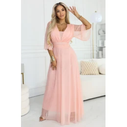 654-4 Dlhé trblietavé šaty nadmernej veľkosti s výstrihom a priehľadnými rukávmi - broskyňové