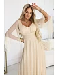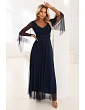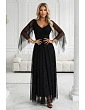 Model má srdiečkový výstrih a jemne splývavý vrchný diel obálkového strihu. Rukávy sú voľné, kapucňové z priehľadnej sieťoviny, ktorá dodáva ľahkosť a je príjemná v pohybe. V páse je široký opasok, ktorý zvýrazňuje siluetu, a spodná časť je v maxi dĺžke a zakončená vrstvou tylu s drobnými lesklými bodkami. Šaty sú vo veľkosti UNI, sú vhodné pre postavy S(36) až XXL(44) a dobre sa uplatnia aj na plus size postavách.