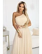 Vínové maxi večerné šaty sú vyrobené z ľahkej, polopriehľadnej tkaniny s jemným brokátovým efektom na mäkkej podšívke. Prestrihnutý vrchný diel na jedno rameno plynulo prechádza do dobre tvarovaného pásu, ktorý je zvýraznený širokou viazankou. Vzdušná, vrstvená sukňa pri pohybe nádherne splýva - vlní sa pri každom kroku a otočke na tanečnom parkete.