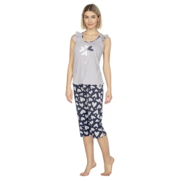 Dámske pyžamo so širokými nohavicami z kvalitnej bavlny. Vytlačené na úrovni hrudníka. Dopĺňajú ich vzorované nohavice s jemnými prestrihmi.