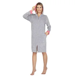 Dámsky krátky župan s kapucňou, vyrobený z jemnej bavlny. Župan na zips s vreckami na bokoch, manžetami a kapucňou lemovanou kontrastnou bavlnou.