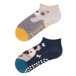 Stopki z wysokiej jakości bawełny, ozdobione buźkami zwierzaków, ściągacz komfortowy. Stopa z silikonowym ABS. Dostępne kolory: (kolor przy palcach): żółty, musztardowy, morski, niebieski, granatowy, jeans.