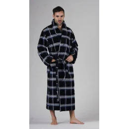 Dlhý pánsky bavlnený župan, tmavomodrá kocka s bielymi a svetlomodrými pruhmi, 510 g/m2.