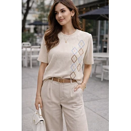 Tento štýlový dámsky sveter v klasickom rovnom strihu je ideálnou voľbou pre ženy, ktoré si cenia pohodlie a nadčasovú eleganciu. Model s krátkymi rukávmi a okrúhlym výstrihom je ideálny na každodenné nosenie, pretože poskytuje voľnosť pohybu a všestrannosť. Jemný geometrický vzor na prednej strane dodáva tomuto kúsku moderný vzhľad, vďaka čomu ho možno ľahko zladiť s ležérnymi aj elegantnejšími súpravami. Sveter je vyrobený z vysokokvalitnej zmesi bavlny (50 %) a akrylu (50 %), je mäkký, príjemný na dotyk a dobre sedí na tele. Materiál je trvanlivý, odolný voči každodennému noseniu a ľahko sa udržiava, takže je praktickou voľbou na každú príležitosť.