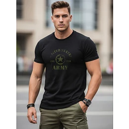 Potlač má vojenský charakter a obsahuje nápisy "United States Army" a "EST. 1776" s ústredným motívom hviezdy, čo dodáva tričku drsný a osobitý vzhľad.