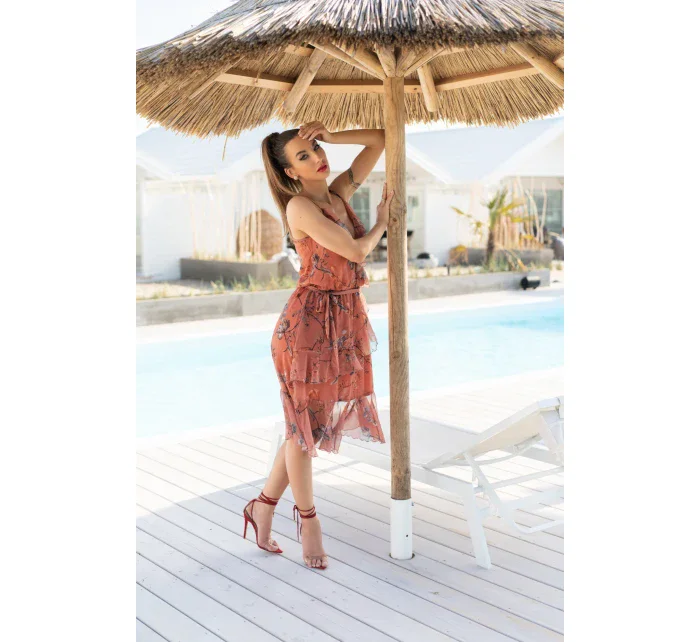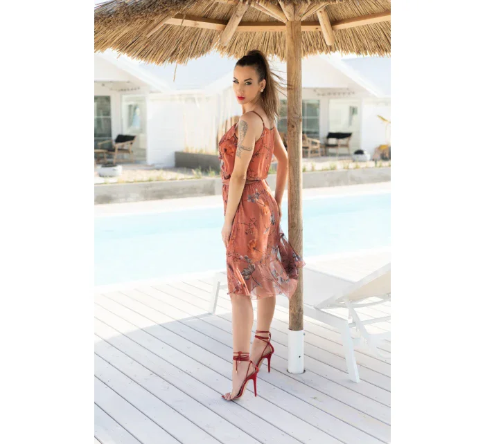 Vliesové kvetinové šaty s tenkými nastaviteľnými ramienkami, hlbokým výstrihom zvýrazneným jemným volánom a zaväzovaním v páse. Šaty sú podšité a majú krásny, vzdušný, veľmi ženský štýl ideálny na leto. Mäkká tkanina: 95 % polyester, 5 % elastan.