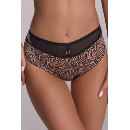 Plavky AV 2191/B Tiger od značky AVA sú určené pre ženy, ktoré oceňujú dravý štýl a eleganciu. Sú vyrobené z elastického úpletu s potlačou tigra, dokonale zvýrazňujú ženské krivky a dodávajú siluete sexappeal. Hrejivý tyl v kombinácii s čiernym lemovaním vytvára výrazný kontrast, ktorý priťahuje pohľad a dodáva spodnej bielizni ľahkosť. Vďaka vysokému obsahu polyamidu sú trvanlivé a odolné voči poškodeniu, zatiaľ čo prímes bavlny a elastanu zaručuje pohodlie pri celodennom nosení.